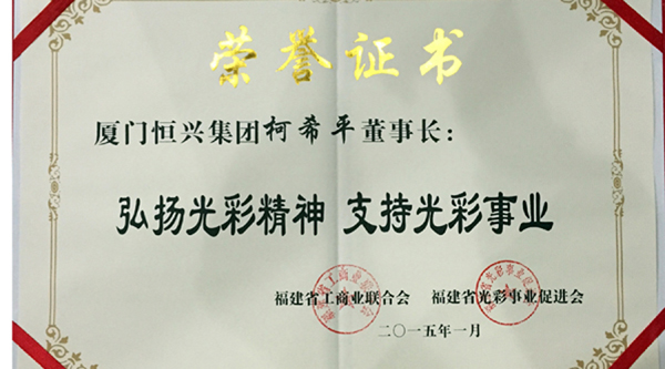 柯希平董事长发扬“致富思源、富而思进、扶危济困、乐善好施、义利兼顾、德行并重、发展企业、回馈社会”的光彩事业精神,,,,,,,积极履行社会责任。。。。。。。在2013-2014年度,,,,,,,为福建省光彩事业促进会捐款100万元,,,,,,,名列各捐资企业/个人第十位,,,,,,,并被授予“弘扬光彩精神、支持光彩事业”荣誉证书。。。。。。。