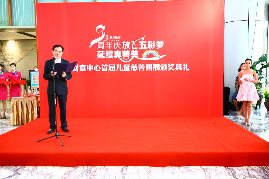上午十点,,,,,,,,在开禾小学精彩的民族舞表演中,,,,,,,,“放飞五彩梦,,,,,,,,延续真善美”财富三周年暨儿童慈善画展颁奖典礼正式拉开序幕。。。。。。。尊龙凯时集团资产管理部总经理虞伯南代表尊龙凯时集团及厦门财富中心上台致辞,,,,,,,,他表示:此次举办儿童慈善画展,,,,,,,,一方面是为了加强财富中心租户之间的互动,,,,,,,,给租户子女提供一个才艺展示的平台,,,,,,,,也借此唤起大家无忧无虑的童年记忆;;;;;;;;另一方面,,,,,,,,希望通过这些天真无邪的孩子们的画笔,,,,,,,,描绘出一个灿烂的明天,,,,,,,,构筑起一座爱心的桥梁。。。。。。。通过慈善义卖的方式将孩子们的爱心和美好愿望传递,,,,,,,,帮助那些求学路上的贫困儿童。。。。。。。