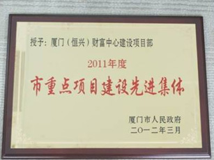 2012年3月,,,,,,,厦门市重点项目办公室、厦门市发展改革委员会、厦门市建设与管理局授予集团公司厦门财富中心“2011年度市重点建设优胜项目”,,,,,,,授予财富中心项目部“2011年度重点项目建设先进集体”殊荣。。。。。。