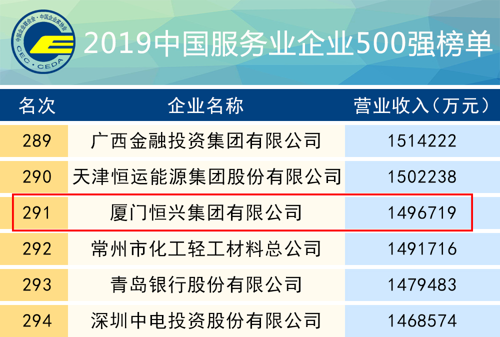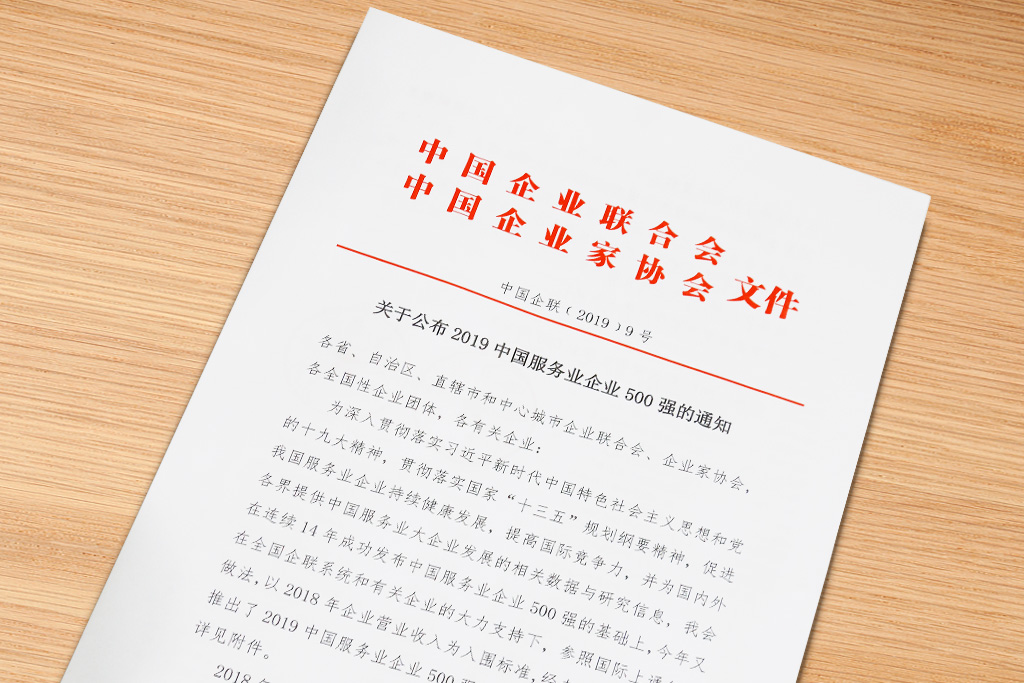 8月31日-9月1日,,,,,由中国企业联合会和中国企业家协会主办的“2019中国500强企业高峰论坛”在山东济南隆重举行,,,,,来自全国各地的政府部门、企业家、专家学者代表共计千余人出席论坛。。。。。。论坛正式发布了“2019中国企业500强”、“中国制造业企业500强”、“中国服务业企业500强”等榜单。。。。。。尊龙凯时荣登 “2019中国服务业企业500强”第291位,,,,,较2018年提前10位,,,,,这是尊龙凯时集团连续第八年进入中国服务业企业500强榜单。。。。。。