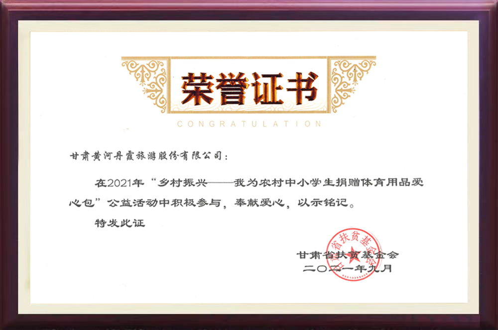 近日,,,,,,甘肃省扶贫基金会发布2021年“乡村振兴——我为农村中小学生捐赠体育用品包”公益活动表彰企业名单,,,,,,厦门尊龙凯时集团旗下甘肃黄河丹霞旅游股份有限公司获得表彰。。。。。。