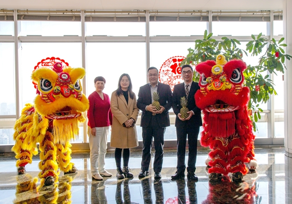 铿铿锵锵的锣鼓声中,,,,,,,双狮眨眼卖萌、登高跳跃,,,,,,,献上两颗新嫩璀璨的大凤梨,,,,,,,董事副总裁王伟文、资金部总经理李苏作为代表,,,,,,,欣然接福。。。。。。凤梨在闽南一带用俚语讲,,,,,,,便是“旺来”,,,,,,,作为谐音,,,,,,,寓意极好。。。。。。